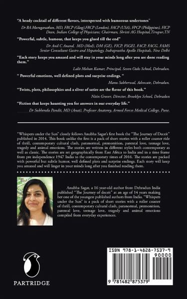 "Whispers under the Sun" closely follows Anubha Sagar's first book the "The Journey of Deceit" published in 2014. This book unlike the first is a pack of short stories with a roller coaster ride of thrill, contemporary cultural clash, paranormal, premonition, parental love, teenage love, tragedy and animal emotions. The stories are written in different styles both contemporary as well as classic. The stories are set geographically from East Africa to India and in a time frame from pre independence 1947 India to the contemporary times of 2016. The stories are packed with powerful but subtle humor, well defined plots and surprise endings. Each story will keep you amazed and will linger in your minds long after you finished reading them.