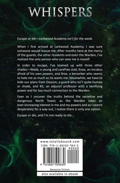 Escape or die-Larkwood Academy isn't for the weak. When I first arrived at Larkwood Academy, I was sure someone would rescue me. After months here at the mercy of the guards, the other residents and even the Warden, I've realized the only person who can save me is myself. In order to escape, I've teamed up with three other shades-Wade, a young and carefree void, Knox, an incubus afraid of his own powers, and Brax, a berserker who seems to hate me as much as he wants me. Meanwhile, we have to hide our plans from Deacon, a guard who isn't quite human or shade, and Kit, an adjunct professor with a terrifying power and far too much connection to the Warden. Even as I uncover the truths behind the secretive and dangerous North Tower, as the Warden takes an ever-increasing interest in me and my powers and as I search desperately for a way out, I realize there is only one option. Escape or die, and I'm not ready to die...