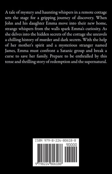 A tale of mystery and haunting whispers in a remote cottage sets the stage for a gripping journey of discovery. When John and his daughter Emma move into their new home, strange whispers from the walls spark Emma's curiosity. As she delves into the hidden secrets of the cottage she unravels a chilling history of murder and dark secrets. With the help of her mother's spirit and a mysterious stranger named James, Emma must confront a Satanic group and break a curse to save her family. Prepare to be enthralled by this tense and thrilling story of redemption and the supernatural.