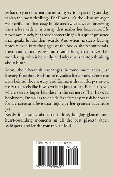 What do you do when the most mysterious part of your day is also the most thrilling? For Emma, it's the silent stranger who drifts into her cozy bookstore twice a week, browsing the shelves with an intensity that makes her heart race. He never says much, but there's something in his quiet presence that speaks louder than words. And when he starts leaving notes tucked into the pages of the books she recommends, their connection grows into something that leaves her wondering: who is he really, and why can't she stop thinking about him? Soon, their bookish exchanges become more than just literary flirtation. Each note reveals a little more about the man behind the mystery, and Emma is drawn deeper into a story that feels like it was written just for her. But in a town where secrets linger like dust in the corners of her beloved bookstore, Emma has to decide if she's ready to risk her heart for a chance at a love that might be her greatest adventure yet. Ready for a story about quiet love, longing glances, and heart-pounding moments in all the best places? Open Whispers, and let the romance unfold.