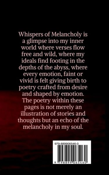Whispers of Melancholy is a collection of poems deeply grounded in the sinister elements of life. This book contains poetry that tackles philosophical themes, emotional decay, abandonment, and legends from the abyss of history. Every page of this book is a thought of the author that lingered too long.Every poem will entail tales that loom on the darker side. Every verse is crafted with love and dedication each and every line of misery poured directly from the soul. These pages are a manifestation of the melancholy that echoes within the author's soul. This book is a journey through the author's mind an escapade filled to the brim with roars of emotion, crafted in fire and molded by desire. This is not just a collection of verses; it is a reflection of the author himself raw, unfiltered, and unafraid to confront truths we often ignore. In the lines of this collection, you will not merely read poems you will feel them. Every stanza will whisper to your heart, and every verse will echo through your soul