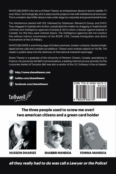 WHISTLEBLOWER is the story of Shane Thawer, an entrepreneur about to launch satellite TV over Africa. Technologically, all is in place but the project is met with interference at every turn. This is a modern-day thriller about a man under siege by corporate and governmental forces. The interference started with SES, followed by Globecast, Wananchi Group, and DVEO. They dragged in Eutelsat who further complicated the matter by dragging in Israeli/Jewish criminals and intelligence agencies (Canada & US) to block a lawsuit against Eutelsat in Canada. For this they used criminal means. The intelligence agencies did not conduct this without indirect involvement of the RCMP, CSIS, Canada Immigration and direct involvement of the US Military. WHISTLEBLOWER is a terrifying saga of broken promises, broken contracts, hacked emails, taped phone calls and constant surveillance. Thawer even endures attacks on his life. The reader is pulled deep into the darkness of international industrial espionage.