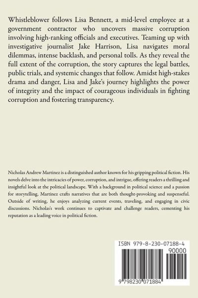 Whistleblower follows Lisa Bennett, a mid-level employee at a government contractor who uncovers massive corruption involving high-ranking officials and executives. Teaming up with investigative journalist Jake Harrison, Lisa navigates moral dilemmas, intense backlash, and personal tolls. As they reveal the full extent of the corruption, the story captures the legal battles, public trials, and systemic changes that follow. Amidst high-stakes drama and danger, Lisa and Jake's journey highlights the power of integrity and the impact of courageous individuals in fighting corruption and fostering transparency.
