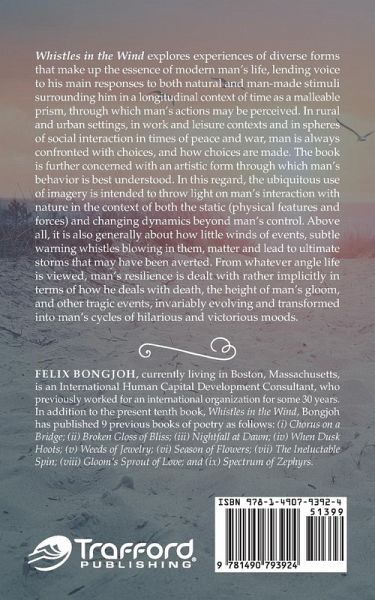 Whistles in the Wind explores experiences of diverse forms that make up the essence of modern man's life, lending voice to his main responses to both natural and man-made stimuli surrounding him in a longitudinal context of time as a malleable prism, through which man's actions may be perceived. In rural and urban settings, in work and leisure contexts and in spheres of social interaction in times of peace and war, man is always confronted with choices, and how choices are made. The book is further concerned with an artistic form through which man's behavior is best understood. In this regard, the ubiquitous use of imagery is intended to throw light on man's interaction with nature in the context of both the static (physical features and forces) and changing dynamics beyond man's control. Above all, it is also generally about how little winds of events, subtle warning whistles blowing in them, matter and lead to ultimate storms that may have been averted. From whatever angle life is viewed, man's resilience is dealt with rather implicitly in terms of how he deals with death, the height of man's gloom, and other tragic events, invariably evolving and transformed into man's cycles of hilarious and victorious moods.