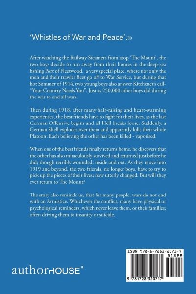 'Whistles of War and Peace'.© After watching the Railway Steamers from atop 'The Mount', the two boys decide to run away from their homes in the deep-sea fishing Port of Fleetwood. a very special place, where not only the men and their trawler fleet go off to War Service, but during that hot Summer of 1914, two young boys also answer Kitchener's call- "Your Country Needs You". Just as 250,000 other boys did during the war to end all wars. Then during 1918, after many hair-raising and heart-warming experiences, the best friends have to fight for their lives, as the last German Offensive begins and all Hell breaks loose. Suddenly, a German Shell explodes over them and apparently kills their whole Platoon. Each believing the other has been killed - vaporised. When one of the best friends finally returns home, he discovers that the other has also miraculously survived and returned just before he did; though terribly wounded, inside and out. As they move into 1919 and beyond, the two friends, no longer boys, have to try to pick up the pieces of their lives; now utterly changed. But will they ever return to The Mount? The story also reminds us, that for many people, wars do not end with an Armistice. Whichever the conflict, many have physical or psychological reminders, which never leave them, or their families; often driving them to insanity or suicide.