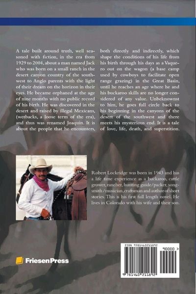 A tale built around truth, well seasoned with fiction, in the era from 1929 to 2004, about a man named Jack who was born on a small ranch in the desert canyon country of the southwest to Anglo parents with the light of their dream on the horizon in their eyes. He became orphaned at the age of nine months with no public record of his birth. He was discovered in the desert and raised by illegal Mexicans, (wetbacks, a loose term of the era), and thus was renamed Joaquin. It is about the people that he encounters, both directly and indirectly, which shape the conditions of his life from his birth through his days as a Vaquero out on the wagon (a base camp used by cowboys to facilitate open range grazing) in the Great Basin, until he reaches an age where he and his buckaroo skills are no longer considered of any value. Unbeknownst to him, he goes full circle back to his beginning in the canyons of the desert of the southwest and there meets his mysterious end. It is a tale of love, life, death, and superstition.