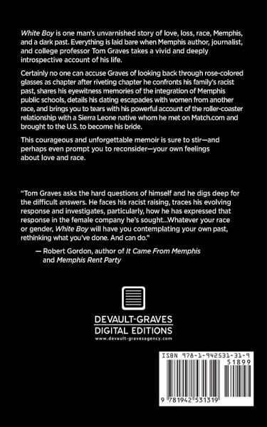 White Boy: A Memoir is one man's unvarnished story of love, loss, race, Memphis, and a dark past. Everything is laid bare when Memphis author, journalist, and college professor Tom Graves takes a vivid and deeply introspective account of his life. Certainly no one can accuse Graves of looking back through rose-colored glasses as chapter after riveting chapter he confronts his family's racist past, shares his eyewitness memories of the integration of Memphis public schools, details his dating escapades with women from another race, and brings you to tears with his powerful account of the roller-coaster relationship with a Sierra Leone native whom he met on Match.com and brought to the U.S. to become his bride. This courageous and unforgettable memoir is sure to stir, and perhaps even prompt you to reconsider, your own feelings about love and race.