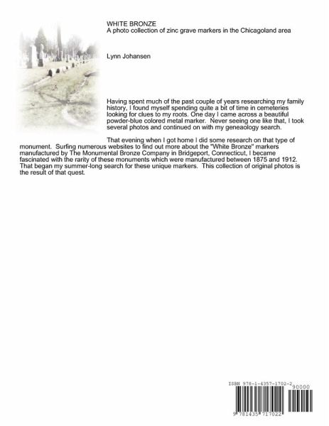 A photo collection in full color of zinc cemetery markers in the Chicagoland area. They were manufactured by the Monumental Bronze Company in Bridgeport, CT and their subsidiaries in the U.S. and Canada between 1875 and 1912. Marketed as superior to stone in terms of durability, the products were referred to as "white bronze." They were cast from 99% pure zinc and were rust resistant. Rare in the Chicago area, this is a collection of original full-color photographs of these remarkable powder-blue monuments.