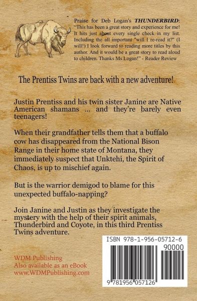Justin Prentiss and his twin sister Janine are Native American shamans … and they're barely even teenagers! When their grandfather tells them that a buffalo cow has disappeared from the National Bison Range in their home state of Montana, they immediately suspect that Unktehi, the Spirit of Chaos, is up to mischief again. But is the warrior demigod to blame for this unexpected buffalo-napping? Join Janine and Justin as they investigate the mystery with the help of their spirit animals, Thunderbird and Coyote, in this third Prentiss Twins adventure.
