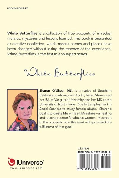 White Butterflies is a collection of true accounts of miracles, mercies, mysteries and lessons learned. This book is presented as creative nonfiction, which means names and places have been changed without losing the essence of the experience. White Butterflies is the first in a four-part series.