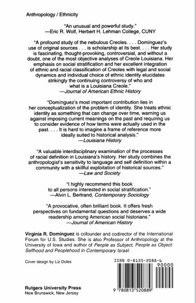 A profound study of the nebulous Creoles. . . . Domínguez's use of original sources . . . is scholarship at its best. . . . Her study is fascinating, thought-provoking, controversial, and without a doubt, one of the most objective analyses of Creole Louisiana. Her emphasis on social stratification and her excellent integration of ethnic and racial classification of Creoles with legal and social dynamics and individual choice of ethnic identity elucidates strikingly the continuing controversy of who and what is a Louisiana Creole.--Journal of American Ethnic History