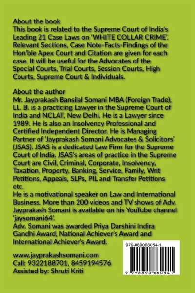 This book is related to the Supreme Court of India's Leading 21 Case Laws on 'WHITE COLLAR CRIME'. Relevant Sections, Case Note-Facts-Findings of the Hon'ble Apex Court and Citation are given for each case. It will be useful for the Advocates of the Special Courts, Session Courts, High Courts, Supreme Court & Individuals. This book is containing a synopsis of 20 leading causes of the Apex Court. Following points are given for each leading case. 1. Name of the Case i. e. Cause title 2. Relevant Sections discussed in the case 3. Hon'ble Judges/Coram of the case 4. Number of PDF Pages in Original Judgement of the case 5. All available Citations of the case 6. Case Note with appeal allowed/ dismissed or disposed off 7. Facts of the case 8. Hon'ble Apex Court's findings, while dismissing/allowing or disposing off the appeal 9. Ratio Decidendi if any. Author: Jayprakash B. Somani, Advocate Supreme Court of India Assisted by: Shruti Kriti Call: 9322188701, 8459194576 Website: www.jayprakashsomani.com