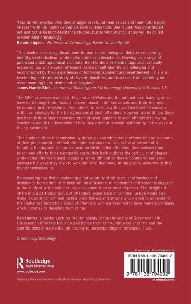 The MPs' expenses scandal in England and Wales and the international banking crisis have both brought into focus a concern about 'elite' individuals and their treatment by criminal justice systems. This interest intersects with a well-established concern within criminology for the transgressions of such offenders. However, up until now there has been little sustained consideration of what happens to such offenders following conviction and little discussion of how they attempt to avoid reoffending in the wake of their punishment. This study rectifies this omission by drawing upon white-collar offenders' own accounts of their punishment and their attempts to make new lives in the aftermath of it. Detailing the impact of imprisonment on white-collar offenders, their release from prison and efforts to be successful again, this book outlines the particular strategies white-collar offenders used to cope with the difficulties they encountered and also analyses the ways they tried to work out 'who they were' in the post-release worlds they found themselves in. Representing the first sustained qualitative study of white-collar offenders and desistance from crime, this book will be of interest to academics and students engaged in the study of white-collar crime, desistance from crime and prison. The insights it offers into a particular group of offenders' experience of criminal justice would also make it useful for criminal justice practitioners and anyone who wishes to understand the challenges faced by a group of offenders who are assumed to have many advantages when it comes to desisting from crime.