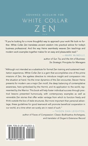 It is said that in traditional Japan the samurai embraced Zen because it helped them to be fearless in adversity, to act quickly and decisively, and to keep focused on their ultimate goal. In White Collar Zen, Steven Heine shows how, by applying Zen principles in our working lives, we can achieve the same results for ourselves. Heine describes the way Zen embraces two different yet harmonious paths. The Way of the Hermit teaches detachment-the mental clarity you need to view your situation dispassionately and impartially, to perceive who is an ally and who is a competitor, to understand what is possible and what is not. The Way of the Warrior teaches the ability to act without hesitation at the proper moment. Together, they can prepare you to meet the challenges of the modern professional world. Heine offers a step-by-step approach to attaining these skills and applying them in daily life. Using real-world examples interwoven with sayings and stories from the Zen tradition, he shows how Zen can help in situations ranging from gaining a deserved promotion to overcoming obstacles that arise from a breakdown in teamwork. He makes it clear that in Zen the path to personal success must be one that values integrity, respects every individual, emphasizes cooperation, and serves the goals of the larger group. Replete with practical advice, White Collar Zen will appeal to many of the same readers who have made The Art of War and The Book of Five Rings so successful. It will certainly fascinate anyone interested in applying Zen principles to achieving professional excellence.