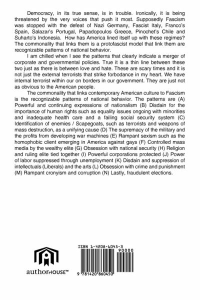 Democracy, in its true sense, is in trouble. Ironically, it is being threatened by the very voices that push it most. Supposedly Fascism was stopped with the defeat of Nazi Germany, Fascist Italy, Franco''s Spain, Salazar''s Portugal, Papadopoulos Greece, Pinochet''s Chile and Suharto''s Indonesia. How has America lined itself up with these regimes? The commonality that links them is a protofascist model that link them are recognizable patterns of national behavior. I am chilled when I see the patterns that clearly indicate a merger of corporate and governmental policies. True it is a thin line between these two just as there is between love and hate. These are scary times and it is not just the external terrorists that strike forbodance in my heart. We have internal terrorist within our on borders in our government. They are just not as obvious to the American people. The commonality that links contemporary American culture to Fascism is the recognizable patterns of national behavior. The patterns are (A) Powerful and continuing expressions of nationalism (B) Disdain for the importance of human rights such as equality issues ongoing with minorities and inadequate health care and a failing social security system (C) Identification of enemies / Scapegoats, such as terrorists and weapons of mass destruction, as a unifying cause (D) The supremacy of the military and the profits from developing war machines (E) Rampant sexism such as the homophobic client emerging in America against gays (F) Controlled mass media by the wealthy elite (G) Obsession with national security (H) Religion and ruling elite tied together (I) Powerful corporations protected (J) Power of labor suppressed through unemployment (K) Disdain and suppression of intellectuals (Liberals) and the arts (L) Obsession with crime and punishment (M) Rampant cronyism and corruption (N) Lastly, fraudulent elections.