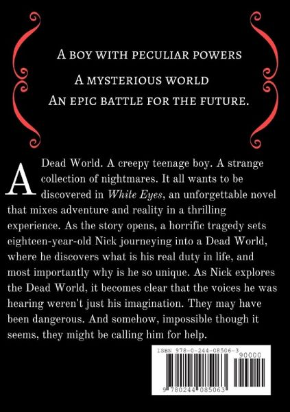 A Dead World. A creepy teenage boy. A strange collection of nightmares. It all wants to be discovered in White Eyes, an unforgettable novel that mixes adventure and reality in a thrilling experience. As the story opens, a horrific tragedy sets eighteen-year-old Nick journeying into a Dead World, where he discovers what is his real duty in life, and most importantly why is he so unique. As Nick explores the Dead World, it becomes clear that the voices he was hearing weren't just his imagination. They may have been dangerous. And somehow, impossible though it seems, they might be calling him for help.