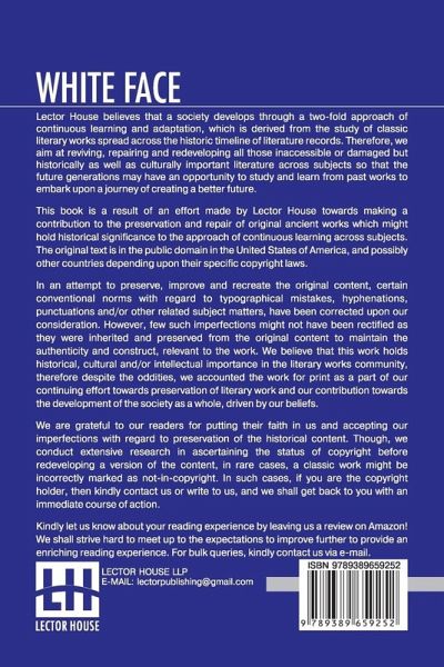 White Face This book is a result of an effort made by us towards making a contribution to the preservation and repair of original classic literature. In an attempt to preserve, improve and recreate the original content, we have worked towards: 1. Type-setting & Reformatting: The complete work has been re-designed via professional layout, formatting and type-setting tools to re-create the same edition with rich typography, graphics, high quality images, and table elements, giving our readers the feel of holding a 'fresh and newly' reprinted and/or revised edition, as opposed to other scanned & printed (Optical Character Recognition - OCR) reproductions. 2. Correction of imperfections: As the work was re-created from the scratch, therefore, it was vetted to rectify certain conventional norms with regard to typographical mistakes, hyphenations, punctuations, blurred images, missing content/pages, and/or other related subject matters, upon our consideration. Every attempt was made to rectify the imperfections related to omitted constructs in the original edition via other references. However, a few of such imperfections which could not be rectified due to intentional\unintentional omission of content in the original edition, were inherited and preserved from the original work to maintain the authenticity and construct, relevant to the work. We believe that this work holds historical, cultural and/or intellectual importance in the literary works community, therefore despite the oddities, we accounted the work for print as a part of our continuing effort towards preservation of literary work and our contribution towards the development of the society as a whole, driven by our beliefs. We are grateful to our readers for putting their faith in us and accepting our imperfections with regard to preservation of the historical content. HAPPY READING!