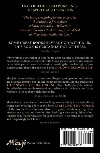 This is the original single-volume release of White Fire Second Edition (2020), re-released with a new cover (2024). White Fire is now also available separately as a two-volume edition (2025). White Fire is significant for seekers everywhere. Mooji's end-of-the-road pointings will undoubtedly serve each one's awakening to the eternal Self. When followed earnestly, Mooji's guidance pulls the externalised mind back to its origin in the most simple, immediate and powerful way. In turn, our pure and timeless Being is revealed to be untouched by the limitations and suffering of the personal ego. This single-volume edition presents a collection of nearly 800 wisdom sayings that encapsulate Mooji's essential spiritual teachings. Mooji's words are complemented by his striking, zen-like brush drawings and a rich selection of black-and-white photos offer glimpses of various facets of Mooji's life. Note that due to the length of this book, it is now also available separately in two volumes, released in 2025: VOLUME I (ISBN 978-1-908408-57-0) and VOLUME II (ISBN 978-1-908408-58-7).