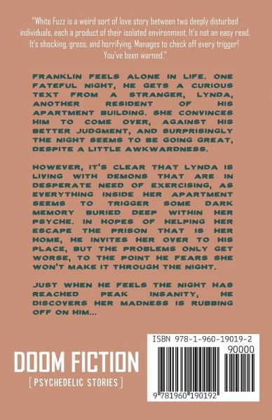 "White Fuzz is a weird sort of love story between two deeply disturbed individuals, each a product of their isolated environment. It's not an easy read. It's shocking, gross, and horrifying. Manages to check off every trigger! You've been warned." Franklin feels alone in life. One fateful night, he gets a curious text from a stranger, Lynda, another resident of his apartment building. She convinces him to come over, against his better judgment, and surprisingly the night seems to be going great, despite a little awkwardness. However, it's clear that Lynda is living with demons that are in desperate need of exorcising, as everything inside her apartment seems to trigger some dark memory buried deep within her psyche. In hopes of helping her escape the prison that is her home, he invites her over to his place, but the problems only get worse, to the point he fears she won't make it through the night. Just when he feels the night has reached peak insanity, he discovers her madness is rubbing off on him...