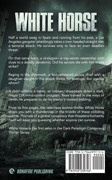 A gangster is caught in a terrorist attack. An orphan child disappears into a CIA mind control project. A global conspiracy to unleash a viral pandemic must be stopped. Half a world away in Spain and running from his past, a Los Angeles gangster unwittingly takes a train that's headed straight into a terrorist attack. He survives only to face an even deadlier threat. On that same train: a virologist with clues to a deadly epidemic. Did his secrets die with him in the strike? Raging in the aftermath, a foul-tempered police chief with a daughter caught in the attack thirsts for revenge. But against whom? An orphan child without a name disappears down a dark, illegal CIA mind-control programme. Now trained in the ways of death, he prepares to do his master's twisted bidding. From its first pages, the relentless techno-thriller White Horse drops you with a thunderclap in the middle of these colliding worlds. This tale of a global conspiracy that threatens humanity itself will keep you guessing whether anyone can survive.