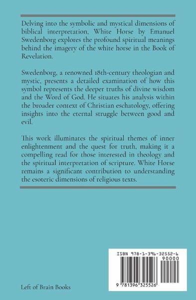 Delving into the symbolic and mystical dimensions of biblical interpretation, White Horse by Emanuel Swedenborg explores the profound spiritual meanings behind the imagery of the white horse in the Book of Revelation. Swedenborg, a renowned 18th-century theologian and mystic, presents a detailed examination of how this symbol represents the deeper truths of divine wisdom and the Word of God. He situates his analysis within the broader context of Christian eschatology, offering insights into the eternal struggle between good and evil. This work illuminates the spiritual themes of inner enlightenment and the quest for truth, making it a compelling read for those interested in theology and the spiritual interpretation of scripture. White Horse remains a significant contribution to understanding the esoteric dimensions of religious texts.
