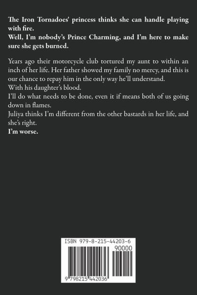 The Iron Tornadoes' princess thinks she can handle playing with fire. Well, I'm nobody's Prince Charming, and I'm here to make sure she gets burned. Years ago their motorcycle club tortured my aunt to within an inch of her life. Her father showed my family no mercy, and this is our chance to repay him in the only way he'll understand. With his daughter's blood. I'll do what needs to be done, even it if means both of us going down in flames. Juliya thinks I'm different from the other bastards in her life, and she's right. I'm worse.