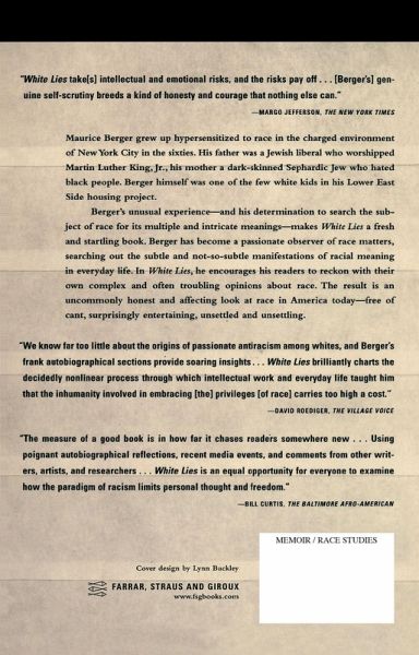 The acclaimed work that debunks our myths and false assumptions about race in America Maurice Berger grew up hypersensitized to race in the charged environment of New York City in the sixties. His father was a Jewish liberal who worshiped Martin Luther King, Jr.; his mother a dark-skinned Sephardic Jew who hated black people. Berger himself was one of the few white kids in his Lower East Side housing project. Berger's unusual experience--and his determination to examine the subject of race for its multiple and intricate meanings--makes White Lies a fresh and startling book. Berger has become a passionate observer of race matters, searching out the subtle and not-so-subtle manifestations of racial meaning in everyday life. In White Lies, he encourages us to reckon with our own complex and often troubling opinions about race. The result is an uncommonly honest and affecting look at race in America today--free of cant, surprisingly entertaining, unsettled and unsettling.