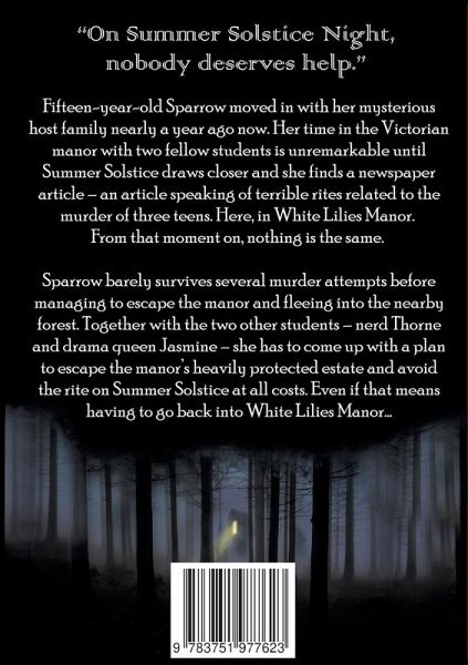 Fifteen-year-old Sparrow moved in with her mysterious host family nearly a year ago now. Her time in the Victorian manor with two fellow students is unremarkable until Summer Solstice draws closer and she finds a newspaper article - an article speaking about terrible rites related to the murder of three teens. Here, in White Lilies Manor. From that moment on, nothing is the same. Sparrow barely survives several murder attempts before managing to escape the manor and fleeing into the nearby forest. Together with the two other students - nerd Thorne and drama queen Jasmine - she has to come up with a plan to escape the manor's heavily protected estate and avoid the rite on Summer Solstice at all costs. Even if that means having to go back into White Lilies Manor...