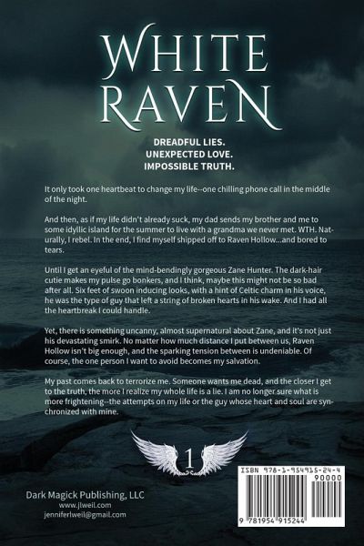 DREADFUL LIES. UNEXPECTED LOVE. IMPOSSIBLE TRUTH. It only took one heartbeat to change my life--one chilling phone call in the middle of the night. And then, as if my life didn't already suck, my dad sends my brother and me to some idyllic island for the summer to live with a grandma we never met. WTH. Naturally, I rebel. In the end, I find myself shipped off to Raven Hollow...and bored to tears. Until I get an eyeful of the mind-bendingly gorgeous Zane Hunter. The dark-hair cutie makes my pulse go bonkers, and I think, maybe this might not be so bad after all. Six feet of swoon inducing looks, with a hint of Celtic charm in his voice, he was the type of guy that left a string of broken hearts in his wake. And I had all the heartbreak I could handle. Yet, there is something uncanny, almost supernatural about Zane, and it's not just his devastating smirk. No matter how much distance I put between us, Raven Hollow isn't big enough, and the sparking tension between is undeniable. Of course, the one person I want to avoid becomes my salvation. My past comes back to terrorize me. Someone wants me dead, and the closer I get to the truth, the more I realize my whole life is a lie. I am no longer sure what is more frightening--the attempts on my life or the guy whose heart and soul are synchronized with mine. WHITE RAVEN is the enthralling first installment in The Raven series. A YA paranormal romance full of atmosphere, self-discovery, and love that will keep you captivated until the very last page. If you love the romance of Twilight, the emotion of Mortal Instruments, and the soul of the Iron Fey, you'll fall in love with White Raven.