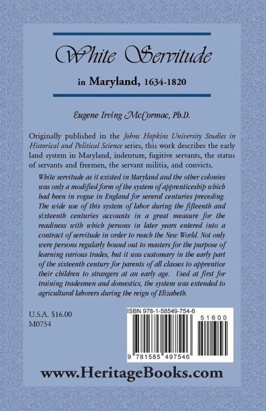 Originally published in the Johns Hopkins University Studies in Historical and Political Science series, this work describes the early land system in Maryland, indenture, fugitive servants, the status of servants and freemen, the servant militia, and convicts. "White servitude as it existed in Maryland and the other colonies was only a modified form of the system of apprenticeship which had been in vogue in England for several centuries preceding. The wide use of this system of labor during the fifteenth and sixteenth centuries accounts in a great measure for the readiness with which persons in later years entered into a contract of servitude in order to reach the New World. Not only were persons regularly bound out to masters for the purpose of learning various trades, but it was customary in the early part of the sixteenth century for parents of all classes to apprentice their children to strangers at an early age. Used at first for training tradesmen and domestics, the system was extended to agricultural laborers during the reign of Elizabeth."