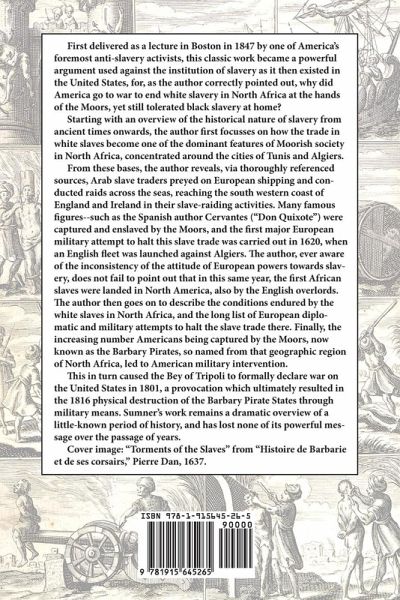 First delivered as a lecture in Boston in 1847 by one of America's foremost anti-slavery activists, this classic work became a powerful argument used against the institution of slavery as it then existed in the United States, for, as the author correctly pointed out, why did America go to war to end white slavery in North Africa at the hands of the Moors, yet still tolerated black slavery at home? Starting with an overview of the historical nature of slavery from ancient times onwards, the author first focusses on how the trade in white slaves become one of the dominant features of Moorish society in North Africa, concentrated around the cities of Tunis and Algiers. From these bases, the author reveals, via thoroughly referenced sources, Arab slave traders preyed on European shipping and conducted raids across the seas, reaching the south western coast of England and Ireland in their slave-raiding activities. Many famous figures--such as the Spanish author Cervantes ("Don Quixote") were captured and enslaved by the Moors, and the first major European military attempt to halt this slave trade was carried out in 1620, when an English fleet was launched against Algiers. The author, ever aware of the inconsistency of the attitude of European powers towards slavery, does not fail to point out that in this same year, the first African slaves were landed in North America, also by the English overlords. The author then goes on to describe the conditions endured by the white slaves in North Africa, and the long list of European diplomatic and military attempts to halt the slave trade there. Finally, the increasing number Americans being captured by the Moors, now known as the Barbary Pirates, so named from that geographic region of North Africa, led to American military intervention. This in turn caused the Bey of Tripoli to formally declare war on the United States in 1801, a provocation which ultimately resulted in the 1816 physical destruction of the Barbary Pirate States through military means. Sumner's work remains a dramatic overview of a little-known period of history, and has lost none of its powerful message over the passage of years. Cover image: "Torments of the Slaves" from "Histoire de Barbarie et de ses corsairs," Pierre Dan, 1637.
