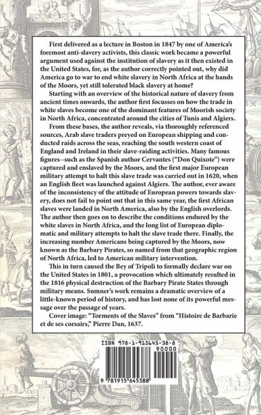 First delivered as a lecture in Boston in 1847 by one of America's foremost anti-slavery activists, this classic work became a powerful argument used against the institution of slavery as it then existed in the United States, for, as the author correctly pointed out, why did America go to war to end white slavery in North Africa at the hands of the Moors, yet still tolerated black slavery at home? Starting with an overview of the historical nature of slavery from ancient times onwards, the author first focusses on how the trade in white slaves become one of the dominant features of Moorish society in North Africa, concentrated around the cities of Tunis and Algiers. From these bases, the author reveals, via thoroughly referenced sources, Arab slave traders preyed on European shipping and conducted raids across the seas, reaching the south western coast of England and Ireland in their slave-raiding activities. Many famous figures--such as the Spanish author Cervantes ("Don Quixote") were captured and enslaved by the Moors, and the first major European military attempt to halt this slave trade was carried out in 1620, when an English fleet was launched against Algiers. The author, ever aware of the inconsistency of the attitude of European powers towards slavery, does not fail to point out that in this same year, the first African slaves were landed in North America, also by the English overlords. The author then goes on to describe the conditions endured by the white slaves in North Africa, and the long list of European diplomatic and military attempts to halt the slave trade there. Finally, the increasing number Americans being captured by the Moors, now known as the Barbary Pirates, so named from that geographic region of North Africa, led to American military intervention. This in turn caused the Bey of Tripoli to formally declare war on the United States in 1801, a provocation which ultimately resulted in the 1816 physical destruction of the Barbary Pirate States through military means. Sumner's work remains a dramatic overview of a little-known period of history, and has lost none of its powerful message over the passage of years. Cover image: "Torments of the Slaves" from "Histoire de Barbarie et de ses corsairs," Pierre Dan, 1637.