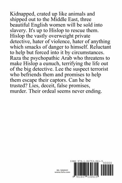 Kidnapped, crated up like animals and shipped out to the Middle East, three beautiful English women will be sold into slavery. It's up to Hislop to rescue them. Hislop the vastly overweight private detective, hater of violence, hater of anything which smacks of danger to himself. Reluctant to help but forced into it by circumstances. Raza the psychopathic Arab who threatens to make Hislop a eunuch, terrifying the life out of the big detective. Lee the suspect terrorist who befriends them and promises to help them escape their captors. Can he be trusted? Lies, deceit, false promises, murder. Their ordeal seems never ending.