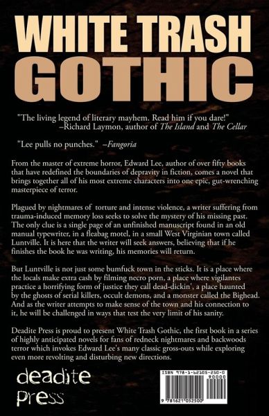 From the master of extreme horror, Edward Lee, author of over fifty books that have redefined the boundaries of depravity in fiction, comes a novel that brings together all of his most extreme characters into one epic, gut-wrenching masterpiece of terror. Plagued by nightmares of torture and intense violence, a writer suffering from trauma-induced memory loss seeks to solve the mystery of his missing past. The only clue is a single page of an unfinished manuscript found in an old manual typewriter, in a fleabag motel, in a small West Virginian town called Luntville. It is here that the writer will seek answers, believing that if he finishes the book he was writing, his memories will return. But Luntville is not just some bumfuck town in the sticks. It is a place where the locals make extra cash by filming necro porn, a place where vigilantes practice a horrifying form of justice they call dead-dickin', a place haunted by the ghosts of serial killers, occult demons, and a monster called the Bighead. And as the writer attempts to make sense of the town and his connection to it, he will be challenged in ways that test the very limit of his sanity. Deadite Press is proud to present White Trash Gothic, the first book in a series of highly anticipated novels for fans of redneck nightmares and backwoods terror which invokes Edward Lee's many classic gross-outs while exploring even more revolting and disturbing new directions.