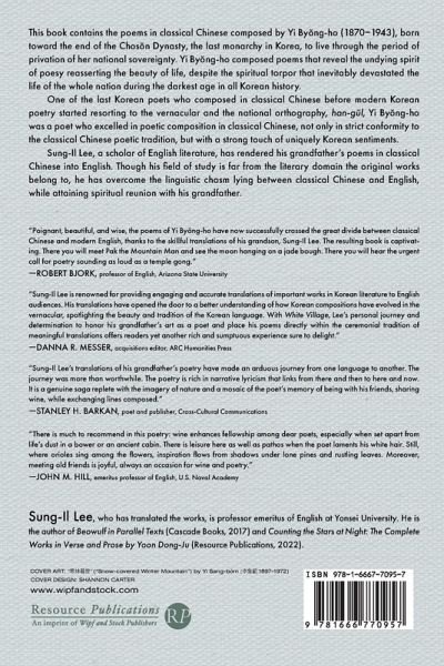 This book contains the poems in classical Chinese composed by Yi By¿ng-ho (1870¿1943), born toward the end of the Chos¿n Dynasty, the last monarchy in Korea, to live through the period of privation of her national sovereignty. Yi By¿ng-ho composed poems that reveal the undying spirit of poesy reasserting the beauty of life, despite the spiritual torpor that inevitably devastated the life of the whole nation during the darkest age in all Korean history. One of the last Korean poets who composed in classical Chinese before modern Korean poetry started resorting to the vernacular and the national orthography, han-g¿l, Yi By¿ng-ho was a poet who excelled in poetic composition in classical Chinese, not only in strict conformity to the classical Chinese poetic tradition, but with a strong touch of uniquely Korean sentiments. Sung-Il Lee, a scholar of English literature, has rendered his grandfather's poems in classical Chinese into English. Though his field of study is far from the literary domain the original works belong to, he has overcome the linguistic chasm lying between classical Chinese and English, while attaining spiritual reunion with his grandfather.