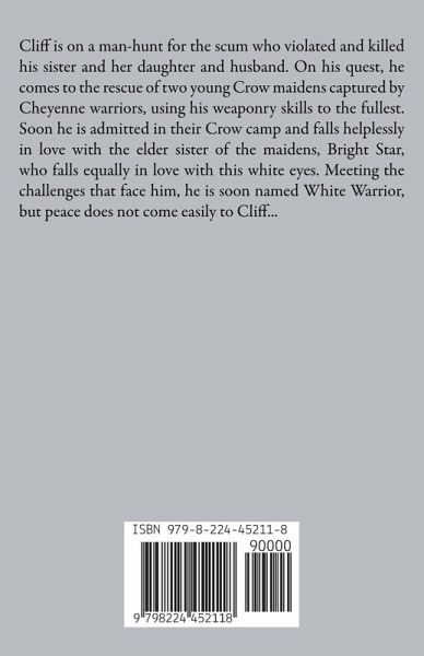 Cliff is on a man-hunt for the scum who violated and killed his sister and her daughter and husband. On his quest, he comes to the rescue of two young Crow maidens captured by Cheyenne warriors, using his weaponry skills to the fullest. Soon he is admitted in their Crow camp and falls helplessly in love with the elder sister of the maidens, Bright Star, who falls equally in love with this white eyes. Meeting the challenges that face him, he is soon named White Warrior, but peace does not come easily to Cliff...