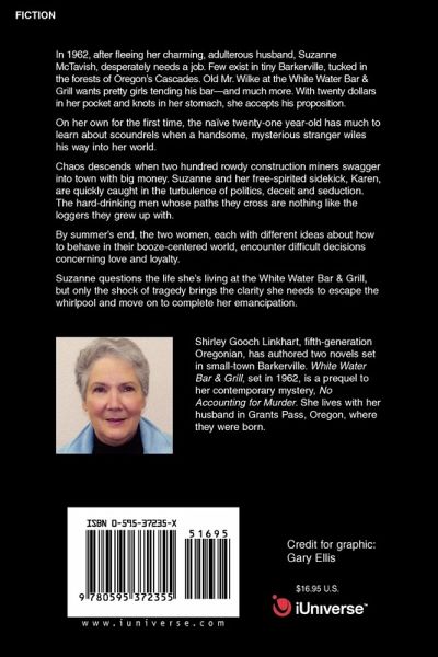 In 1962, after fleeing her charming, adulterous husband, Suzanne McTavish, desperately needs a job. Few exist in tiny Barkerville, tucked in the forests of Oregon's Cascades. Old Mr. Wilke at the White Water Bar & Grill wants pretty girls tending his bar-and much more. With twenty dollars in her pocket and knots in her stomach, she accepts his proposition. On her own for the first time, the naïve twenty-one year-old has much to learn about scoundrels when a handsome, mysterious stranger wiles his way into her world. Chaos descends when two hundred rowdy construction miners swagger into town with big money. Suzanne and her free-spirited sidekick, Karen, are quickly caught in the turbulence of politics, deceit and seduction. The hard-drinking men whose paths they cross are nothing like the loggers they grew up with. By summer's end, the two women, each with different ideas about how to behave in their booze-centered world, encounter difficult decisions concerning love and loyalty. Suzanne questions the life she's living at the White Water Bar & Grill, but only the shock of tragedy brings the clarity she needs to escape the whirlpool and move on to complete her emancipation.