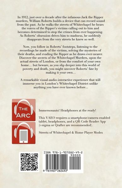 In 1912, just over a decade after the infamous Jack the Ripper murders, William Roberts builds a device that can record sound from the past. As he walks the streets of Whitechapel he hears the voices of the Ripper's victims calling out to him and becomes determined to stop the crimes from ever happening. As Roberts' obsession drives him to madness, he suddenly disappears from the very streets he knew so well. Now, you follow in Roberts' footsteps, listening to the recordings he made of the victims, solving the mysteries of their deaths, and evading the Ripper as he draws ever-nearer. Discover the secrets of the Whitechapel Murders, upon the actual streets of London, or from the comfort of your own home... but beware, as you slip deeper into this world of poverty and death, you might uncover Roberts' fate by making it your own... A remarkable visual-audio-interactive experience that will immerse you in London's Whitechapel District unlike anything you have ever known before... This VAEO requires a smartphone/camera-enabled tablet, headphones, a QR Code Reader App (most smarphones have it built into the camera function) and the ability to face your inner terrors.