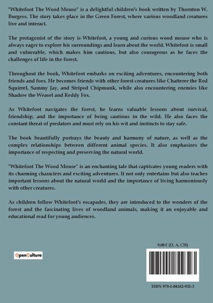 "Whitefoot The Wood Mouse" is a delightful children's book written by Thornton W. Burgess. The story takes place in the Green Forest, where various woodland creatures live and interact. The protagonist of the story is Whitefoot, a young and curious wood mouse who is always eager to explore his surroundings and learn about the world. Whitefoot is small and vulnerable, which makes him cautious, but also courageous as he faces the challenges of life in the forest. Throughout the book, Whitefoot embarks on exciting adventures, encountering both friends and foes. He becomes friends with other forest creatures like Chatterer the Red Squirrel, Sammy Jay, and Striped Chipmunk, while also encountering enemies like Shadow the Weasel and Reddy Fox. As Whitefoot navigates the forest, he learns valuable lessons about survival, friendship, and the importance of being cautious in the wild. He also faces the constant threat of predators and must rely on his wit and instincts to stay safe. The book beautifully portrays the beauty and harmony of nature, as well as the complex relationships between different animal species. It also emphasizes the importance of respecting and preserving the natural world. "Whitefoot The Wood Mouse" is an enchanting tale that captivates young readers with its charming characters and exciting adventures. It not only entertains but also teaches important lessons about the natural world and the importance of living harmoniously with other creatures. As children follow Whitefoot's escapades, they are introduced to the wonders of the forest and the fascinating lives of woodland animals, making it an enjoyable and educational read for young audiences.