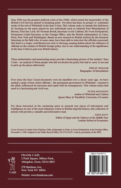 The Daily Telegraph, 3/3/00 - reviewed by Douglas Hurd "So much has been written about the role of the politicians in the Suez affair - Butler, Macmillan, Eden himself - that the story has become repetitious. The journal Contemporary British History has published these admirable essays on the senior officials and serving officers. It is a brilliant idea." The Spectator, 1/4/00 - review by Donald Cameron-Watt "Significant details of the various cock-ups that beset the operation only leaked out gradually beyond the circle of politicians, journalists, academics and other students of the machinery of British government and foreign policy-making. Suez buffs will find in Whitehall and the Suez Crisis a first account of how those internal cock-ups and deceits affected 12 of the leading officials concerned with British policy.... Taken together they give a remarkably consistent picture." Contemporary British History "can be confidently recommended as an important contribution to our understanding of one of the central events in Britain"s twentieth century political history" The Frontline "should be prescribed as a textbook for trainees in the diplomatic service. Nothing like it has appeared before" Twentieth Century British History "well-written and well researched papers that focus on an important individual" The International History Review "a groundbreaking book