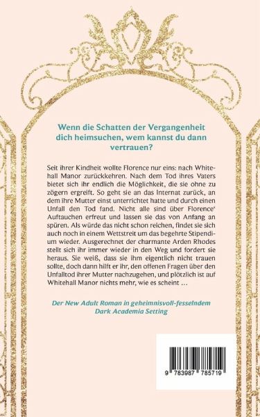 Wenn die Schatten der Vergangenheit dich heimsuchen, wem kannst du dann vertrauen?Der New Adult Roman in geheimnisvoll-fesselndem Dark Academia SettingSeit ihrer Kindheit wollte Florence nur eins: nach Whitehall Manor zurückkehren. Nach dem Tod ihres Vaters bietet sich ihr endlich die Möglichkeit, die sie ohne zu zögern ergreift. So geht sie an das Internat zurück, an dem ihre Mutter einst unterrichtet hatte und durch einen Unfall den Tod fand. Nicht alle sind über Florence Auftauchen erfreut und lassen sie das von Anfang an spüren. Als würde das nicht schon reichen, findet sie sich auch noch in einem Wettstreit um das begehrte Stipendium wieder. Ausgerechnet der charmante Arden Rhodes stellt sich ihr immer wieder in den Weg und fordert sie heraus. Sie weiß, dass sie ihm eigentlich nicht trauen sollte, doch dann hilft er ihr, den offenen Fragen über den Unfalltod ihrer Mutter nachzugehen, und plötzlich ist auf Whitehall Manor nichts mehr, wie es scheint Erste Leser:innenstimmenBewegende Enemies-to-Lovers Romance, die mich komplett in den Bann gezogen hat! Das Internat-Setting ist einfach perfekt, um die Außenwelt zu vergessen. Starke Protagonistin, mysteriöse Familiengeheimnisse und eine emotionale Liebesgeschichte alles was ich an einem Buch liebe!