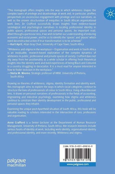 Drawing on theories of whiteness, stigma, identity formation and identity work, this monograph aims to explore the ways in which racial categories continue to structure the lives of professionals of colour in South Africa. Using a Bourdieusian lens, it draws on personal narratives of professionals in the fields of accounting, engineering and industrial psychology, examining how stigma and whiteness continue to constrain their identity development in the public, professional and personal spaces they inhabit.