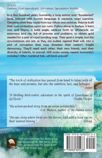In a few hundred years, humanity is long extinct and "Awakened" birds, imbued with human language & sapience, reign supreme. Gleaning what they could from our refuse and archives, they've built their own civilization upon our ruins. Follow along as Sashya, a barn owl, and Pepro, a bald eagle, venture forth to Whiterock, an enormous bird city full of promise and problems, to obtain gold needed for a pair of royal bonding rings. Their goal is simple, but the circumstances are not, as they are pulled, against their will, into a plot of corruption that may threaten their nation's fragile democracy. They'll need each other, their new friends, and their diversity of talents, to prevail. Will avian society repeat humanity's mistakes? After mankind fails, will birds prevail? Contains mature themes of profanity, sexual innuendo, and close combat.
