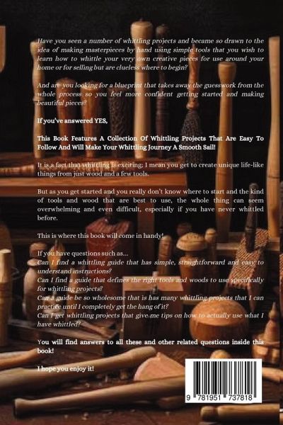 Have you seen a number of whittling projects and became so drawn to the idea of making masterpieces by hand using simple tools that you wish to learn how to whittle your very own creative pieces for use around your home or for selling but are clueless where to begin? And are you looking for a blueprint that takes away the guesswork from the whole process so you feel more confident getting started and making beautiful pieces? If you've answered YES, This Book Features A Collection Of Whittling Projects That Are Easy To Follow And Will Make Your Whittling Journey A Smooth Sail! It is a fact that whittling is exciting; I mean you get to create unique life-like things from just wood and a few tools. But as you get started and you really don't know where to start and the kind of tools and wood that are best to use, the whole thing can seem overwhelming and even difficult, especially if you have never whittled before. This is where this book will come in handy! If you have questions such as... Can I find a whittling guide that has simple, straightforward and easy to understand instructions? Can I find a guide that defines the right tools and woods to use specifically for whittling projects? Can a guide be so wholesome that is has many whittling projects that I can practice until I completely get the hang of it? Can I get whittling projects that give me tips on how to actually use what I have whittled? The answer to all of these questions is a definite YES so keep on reading. More specifically, you will discover: The best type of wood to use for whittling The various techniques you will be using to whittle your wood which is critical for how your end product will look like The whittling tools you will need Some pointers to guide you in the right direction when whittling Essential tips to make whittling easy Easy to follow whittling projects with images of how the end product should look like Each of the projects includes the tools and materials you will need and a procedure that is oh-so-easy to follow And so much more! And yes, even if you've never heard of whittling and you've never tried it before because you may think that it can only be done by pros, this book will prove you wrong with its simple projects!