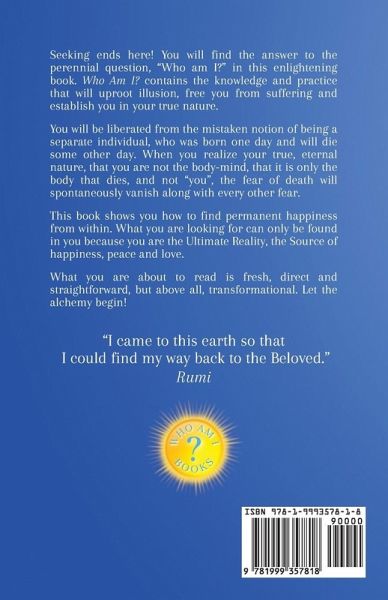 Who Am I? offers answers to anyone searching for a greater understanding of who we are and why we are here. And not only that, the uplifting, vibrational wisdom it contains, enables a true experience of the Self. Who Am I? is a refreshing read as it crosses all barriers. Not limited by any belief system, philosophy, religion, spirituality, or genre, it speaks to us all. This book is not just another self-help book offering guidance, advice, or quick-fix tips for living. Who Am I? is alive with presence, purity, energy, truth and light. This beautiful, self-transforming gift has the power to awaken readers to feel the magic in their everyday existence, and realize that life is much more than it appears to be. Who Am I? is also a love story depicting the lover in search of the Beloved, taking us on an illuminating and impassioned journey of Self-discovery. The search ends when Truth and Love shine from within and light the way back home to the Self, where in quietude, the Ultimate Reality that we are, that we have always been, and will always be, is revealed. If readers absorb the knowledge and follow the suggested practices, slowly but surely, they will be liberated from who they once thought they were. And then, finally, with conviction, they will realize their true nature which is complete, immortal, infinite Presence and part of the one Reality we all share. Who Am I? is written in a simple, light, and humorous style. While the content addresses some heavyweight, existential questions, it is intermingled with references to contemporary lifestyle and celebrities, to produce an easy-to-read, captivating book for all ages.