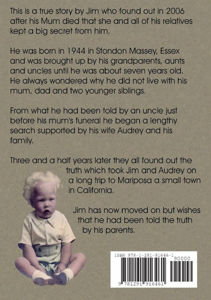 This is a true story by Jim who found out in 2006 after his Mum died that she and all of his relatives kept a big secret from him. He was born in 1944 in Stondon Massey, Essex and was brought up by his grandparents, aunts and uncles until he was about seven years old. He always wondered why he did not live with his Mum, Dad and two younger siblings. From what he had been told by an uncle just before his Mum's funeral he began a lengthy search supported by his wife Audrey and his family. Three and a half years later they all found out the truth which took Jim and Audrey on a long trip to Mariposa a small town in California. Jim has now moved on but wishes that he had been told the truth by his parents.