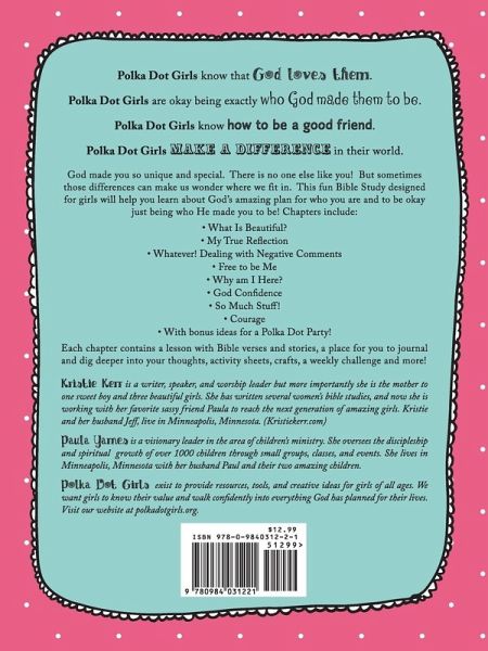 God made you so unique and special. There is no one else like you! But sometimes those differences can make us wonder where we fit in. This fun Bible Study designed for girls will help you learn about God's amazing plan for who you are and to be okay just being who He made you to be! Chapters include: What Is Beautiful? My True Reflection Whatever! Dealing with negative comments Why am I Here? God Confidence So Much Stuff! and Courage Each chapter contains a lesson with Bible verses and stories, a place for you to journal and dig deeper into your thoughts, activity sheets, crafts, a weekly challenge and more!