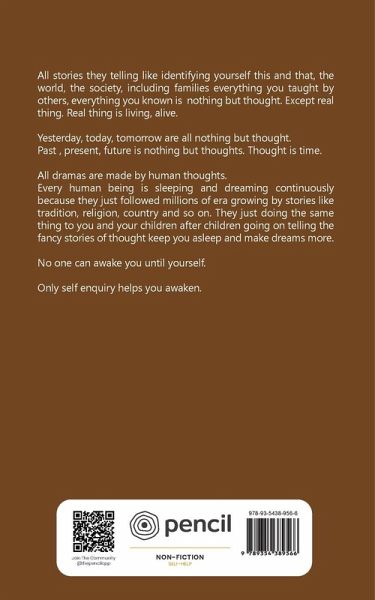 All stories they telling like identifying yourself this and that, the world, The society, including families everything you taught by others, everything you known is nothing but thought. Except real thing. Real thing is living, alive. Yesterday, today, tomorrow are all nothing but thought. Past, present, future is nothing but thoughts. Thought is time. All dramas are made by human thoughts. Every human being is sleeping and dreaming continuously because they just followed millions of era growing by stories like tradition, religion, country and so on. They just doing the same thing to you and your children after children going on telling the fancy stories of thought keep you asleep and make dreams more. No one can awake you until yourself. Only self enquiry helps you awaken.