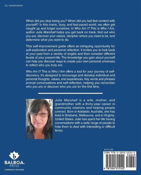 When did you stop being you? When did you last feel content with yourself? In this manic, busy, and fast-paced world, we often get caught up and forget ourselves. In Who Am I? This is Who I Am, author Julie Marshall helps you get back on track, find out who you are, discover your values, decipher where you need to be, and determine what you want to do. This self-improvement guide offers an intriguing opportunity for self-exploration and personal reflection. It invites you to look back at your past from a variety of angles and then consider different facets of your present life. The knowledge you gain about yourself can help you discover ways to create your own personal universes to reflect who you truly are. Who Am I? This is Who I Am offers a tool for your journey of self-discovery. It's designed to encourage and develop individual and personal thoughts, values, and experiences. Key words and phrases prompt conversations and self-reflection, helping you remember who you are or discover who you are for the first time.