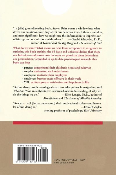 An outside the box approach to understanding individual behavior. Reiss clearly explains the sixteen basic desires, and shows how to easily plot one s own desire profile. Readers of Who Am I? will gain valuable insight into their motivational styles?and have a lot of fun doing so. ?Edward Zigler, Sterling Professor of Psychology, Yale University